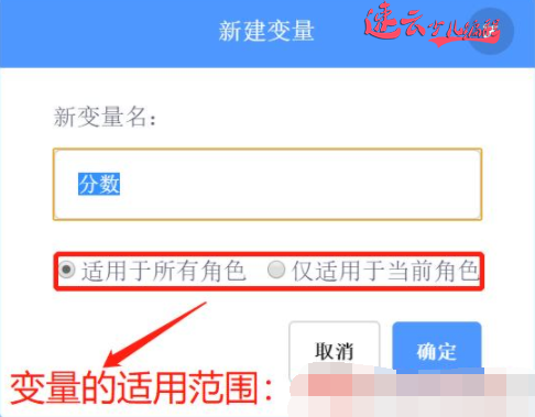 我们可以在“代码”标签页中的“变量”积木中,点击“建立一个变量”按钮来创建变量。然后,弹出一个“新建变量”窗口,然后需要给这个变量取一个名字,并且可以选择是让它“适用于所有角色”,还是“仅适用于当前的角色”,这决定了变量的适用范围(术语叫作用域)