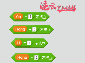 最后还有一条长语句:就是符合上面五种条件后,剩下的可能性就是最终答案了,怎么把答案说出来呢?这里面要用到昨天学的连接命令,把文字和变量连接起来。(把“小英的哥哥是”这段文本和链表第‘Yin’个变量链接起来)