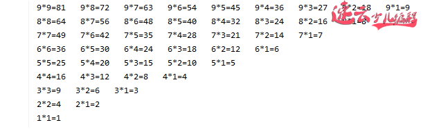 上面为正九九乘法表,下面为倒九九乘法表。效果如下: