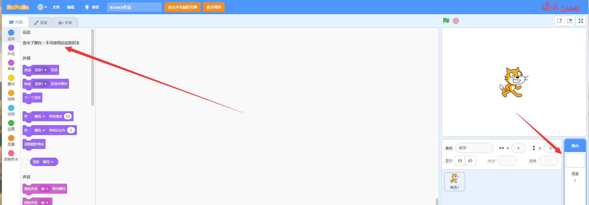 解析:Scratch的舞台设计,即背景设计,与角色设计有很多区别。其中最大的区别就是舞台不会动,虽然有运动区的标签,但是里面没有命令。选项D,画笔区有一条命令:清空。如下图所示: